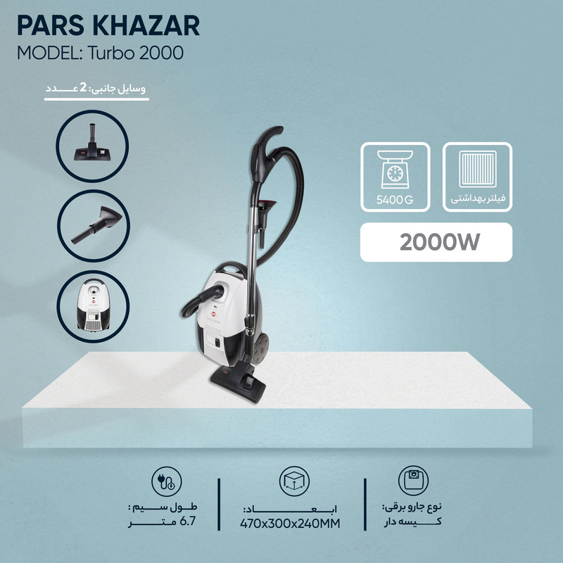 جاروبرقی «پارس خزر» مدل «Turbo 2000» از جاروبرقیهای پرقدرت و خوشساخت این شرکت است که از دستهی جاروبرقیهای کیسهدار محسوب میشود. مخزن جارو دارای ظرفیت 6 لیتر است و موتور آن با توان 2000 وات قدرت مکش آشغالها را از انواع سطوح دارد. جاروبرقی Turbo 2000 به همراه پاکتهای کاغذی استفاده میشود که یکبار مصرف هستند و بعد از پرشدن نیاز به تعویض دارند. چراغ نشانگر روی بدنه شما را از زمان مناسب تعویض پاکت مطلع میکند. سیم جاروبرقی حدود 6.7 متر طول دارد و به کاربر اجازه میدهد بدون نیاز به عوضکردن پریز برق، فضایی به شعاع 8 متر را جاروکشی کند. تنظیم مکش جارو از طریق دکمهی اسلایدی روی بدنه انجام میپذیرد. این مدل مانند اکثر جاروبرقیهای امروزی دارای ویژگی سیمجمعکن خودکار است. برخورداری از سری مخصوص درز و گوشهها و برس مبلمان از دیگر ویژگیهای کاربردی این مدل است که باعثشده انواع سطوح با این جارو قابل تمیزشدن باشند. از دیگر خصوصیات کاربردی این مدل وجود سیستم دمنده (Blower) است که میتواند برای زدودن گردوغبار مورد استفاده قرار گیرد. خرطومی جارو با چرخش 360 درجه کار با دستگاه را در زوایای مختلف آسان کرده است. سیستم ایمنی جارو با تشخیص دمای دستگاه از داغشدن بیش از حد و آسیبدیدن موتور جلوگیری میکند.